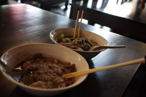 สุดท้ายก็สั่งก๋วยเตี๋ยวน้ำตก+ลูกชิ้น+ไส้กรอก+น้ำเปล่ามานั่งกิน แต่อากาศมันร้อนไปหน่อยช่วงนั้นไม่มีลมเลยมันเลยร้อนๆ ก็ไม่ไหวละอากาศแบบนี้มันต้องเป็ปซี่ดีที่สุด!(จริงๆ ซื้อโค้กแหละ) หลังจากกินเสร็จก็เดินหาห้องน้ำล้างหน้าล้างตากันซะหน่อยเพราะเหงื่อออกแบบซึมๆ ให้เหนียวตัวเล่น เสร็จแล้วก็เริ่มเดินทัวร์ด้านในตลาดน้ำก่อน